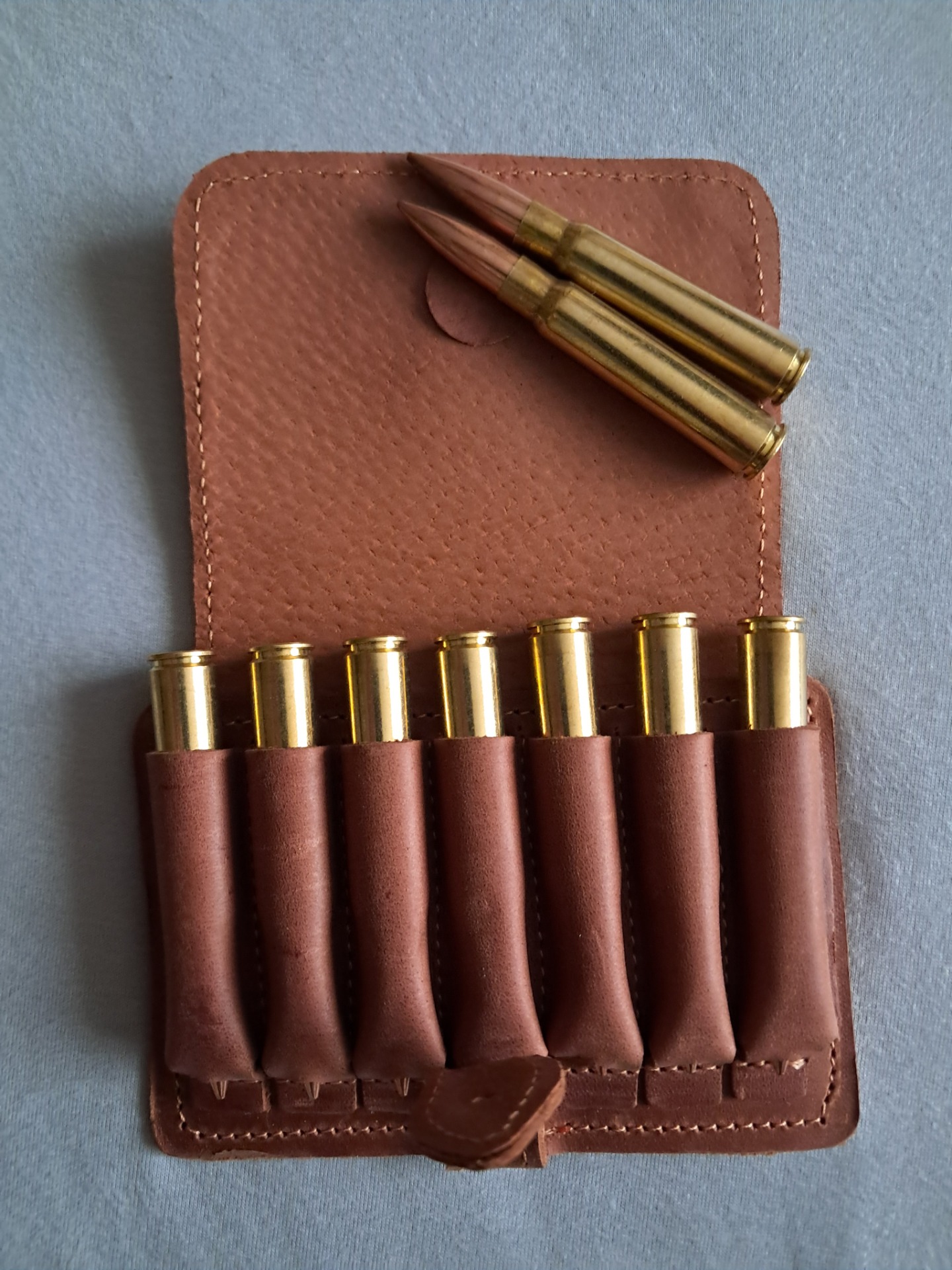 Kožené pouzdro na 7 kulových nábojů hnědé - představuje praktické a bezpečné řešení pro každého střelce. Tento výrobek kombinuje odolnou konstrukci, kompaktní tvar a funkční design. Díky přesnému provedení uchová náboje chráněné před vlhkostí, prachem i mechanickým poškozením. materiál: hovězina rozměry: 13,5 x 10 cm uzavřené pouzdro na 7 kulových nábojů ze zadní strany úchyt na opasek barva: světlá nebo tmavá hnědá, na fotce náboje 8x57