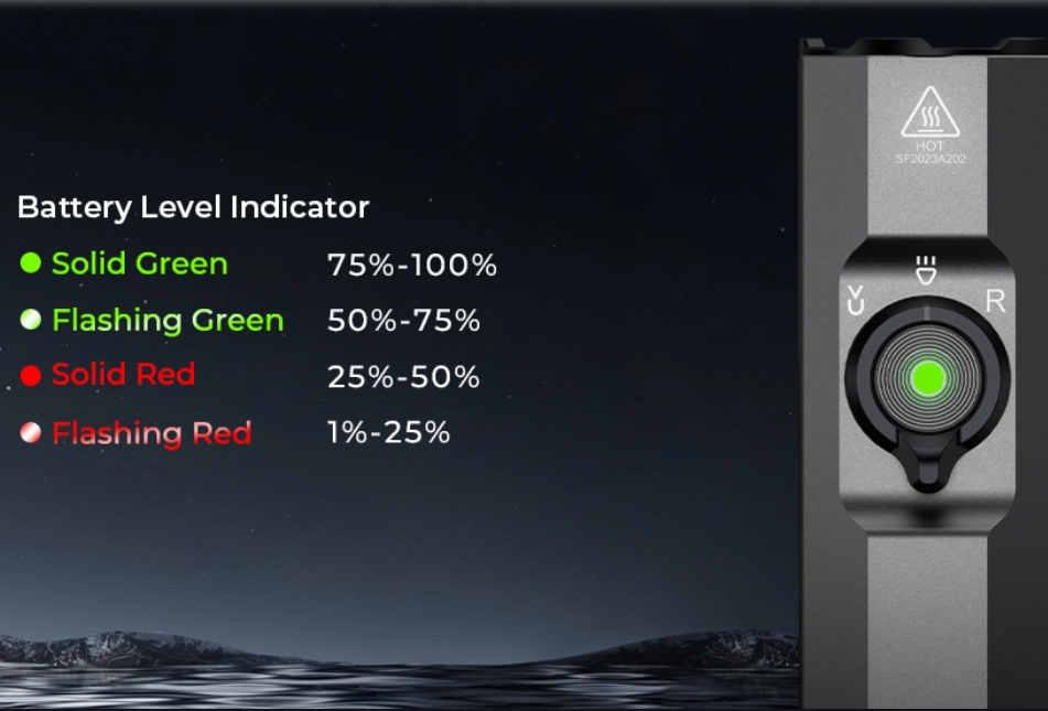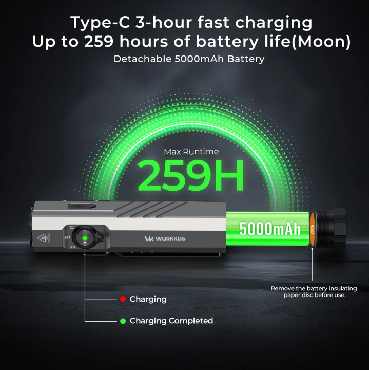 – Vestavěná baterie 5000 mAh 21700 s nabíjením přes USB-C zajišťuje spolehlivý chod světla pro delší používání bez přerušení.