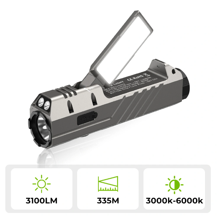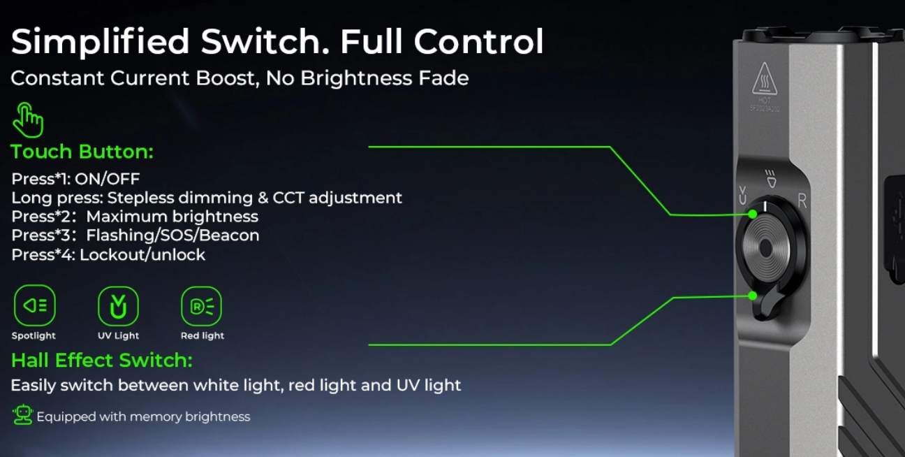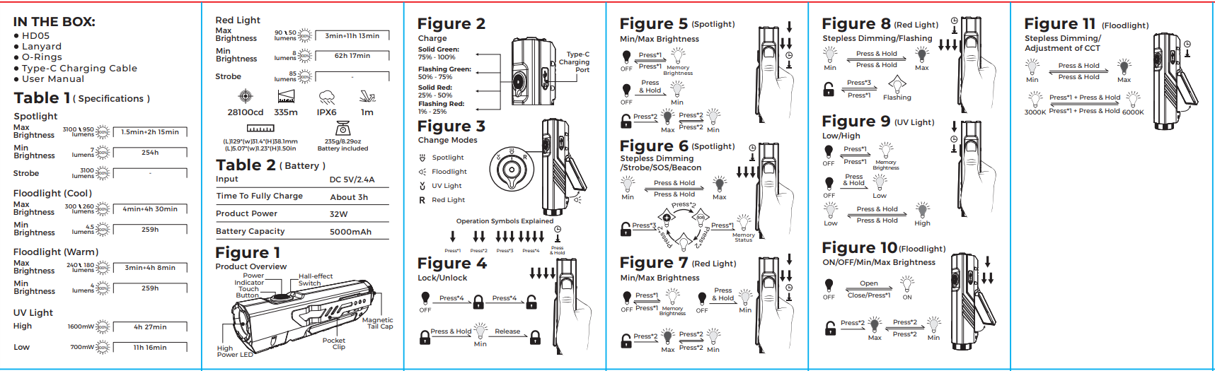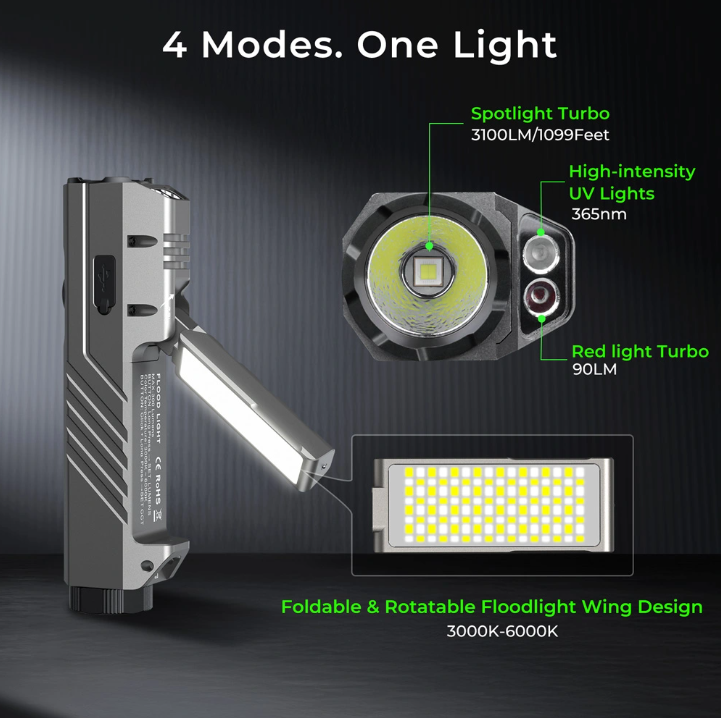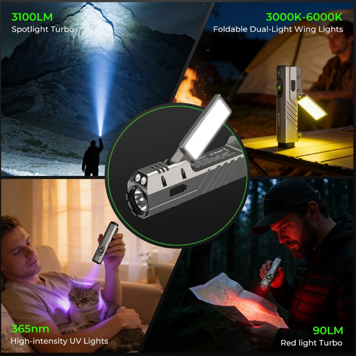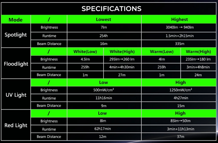 – Obsahuje bodové světlo, široký rozptylový světlomet, červené světlo (8–90 lm, 3 úrovně) a UV světlo 365 nm (700–1600 mW) pro venkovní, noční a pracovní použití: červené světlo pro noční vidění s nízkým rušením, UV světlo pro inspekce, detekci netěsností, prasklin nebo skrytých značek při údržbě a opravách.