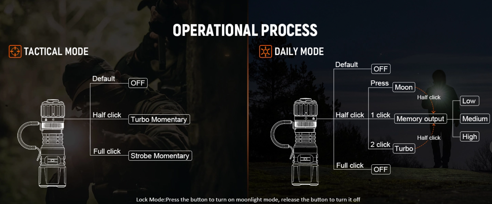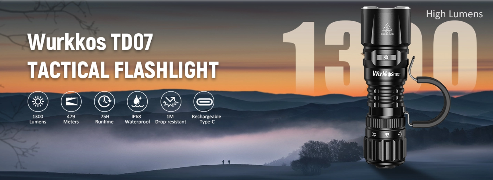 Úvod do TD07 1. Okamžité kliknutí Rychlým stisknutím okamžitě aktivujte režim Turbo (1300 lumenů) nebo Stroboskop, což zajistí okamžitou reakci v nouzových situacích. 2. Maximální světelný tok 1300 lumenů a dosvit paprsku 479 m Vybaven LED diodou SFT25R s úzkým 7° bodovým světlem a širokým 71° rozsvícením, což zajišťuje spolehlivé osvětlení jak pro taktické použití na krátkou vzdálenost, tak pro pátrací mise na dlouhé vzdálenosti. 3. Dva režimy pro venkovní i taktické použití Nabízí venkovní i taktický režim pro splnění různých potřeb. Venkovní režim zahrnuje Měsíc (2 lm), Nízký (20 lm), Střední (240 lm), Vysoký (700 lm), Turbo (1300 lm) a Stroboskop pro aktivity, jako je kempování, turistika, pátrání a noční hlídky. 4. Odolný a tepelně odolný Vyrobeno z vojenského hliníku 6061 s tvrdým eloxovaným povlakem, který poskytuje vynikající odolnost a odvod tepla. Díky voděodolnosti IP68, ochraně proti přepólování a ochraně proti teplotě/nízkému napětí je tato svítilna navržena pro provoz v náročných podmínkách. 5. Kompaktní a snadno přenosná Kompaktní design (délka 99 mm x průměr hlavy 30 mm) a hmotnost pouhých 80 g (0,18 lb) usnadňuje přenášení a ovládání jednou rukou. Ideální pro osobní obranu, zásah v nouzi a každodenní nošení.