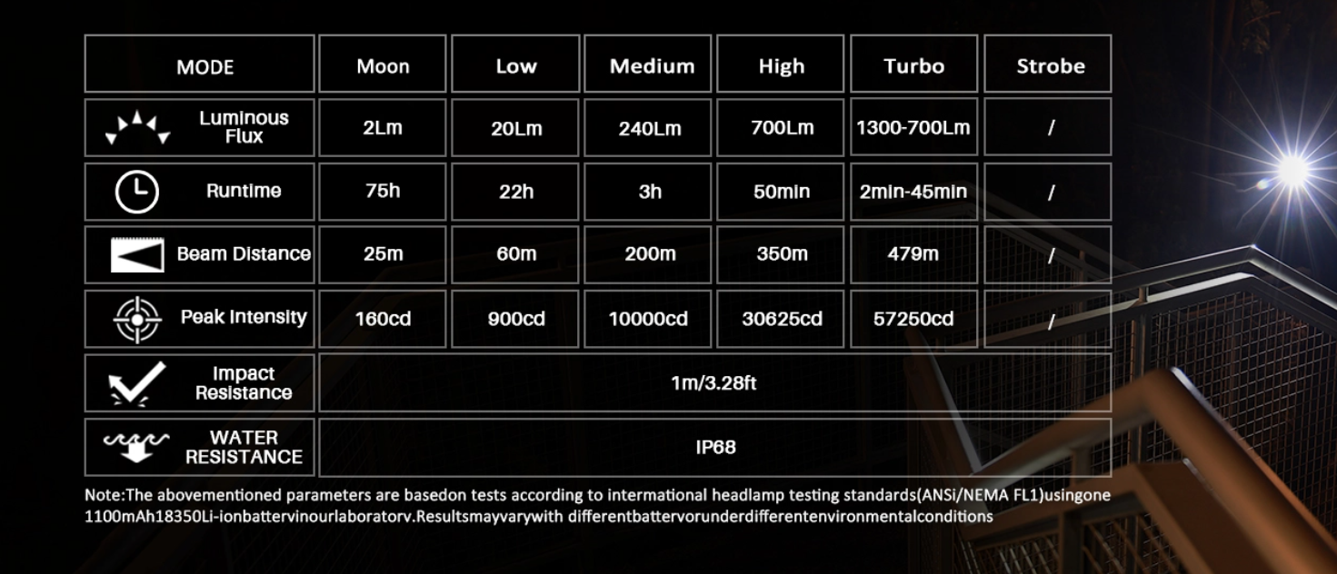 - Tělo svítilny: Letecký hliník 6061. Vyrobeno CNC s tvrdým eloxováním dle vojenské specifikace typu III, antiabrazivní povrchová úprava pro dosažení robustní konstrukce, geometrie odolné proti nárazu a lepší výměny tepla.